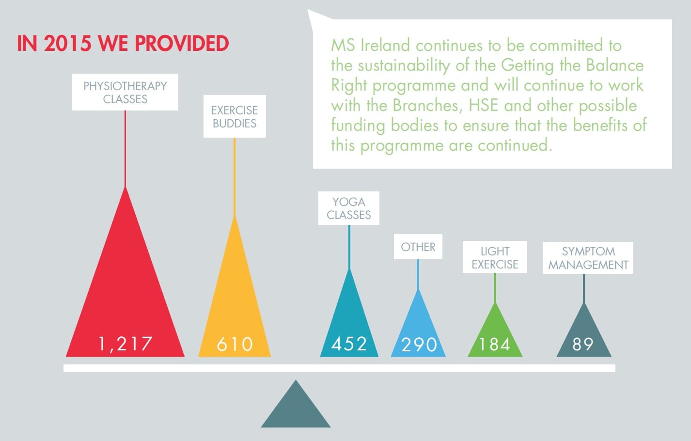The results of GTBR have fundamentally changed the way MS Ireland delivers their physiotherapy services. GTBR classes, utilising the research findings, are now rolled out across all regions by MS Ireland, and people are benefitting continuously from this evidence based, effective treatment. The 2015 MS Ireland Annual Report highlights that 1,217 took part in GTBR Physio Classes, 610 benefitted from individual exercise buddies and 452 took part in beneficial Yoga classes thus the research is directly reaching almost 25% of people living with MS in Ireland. (Source 2)